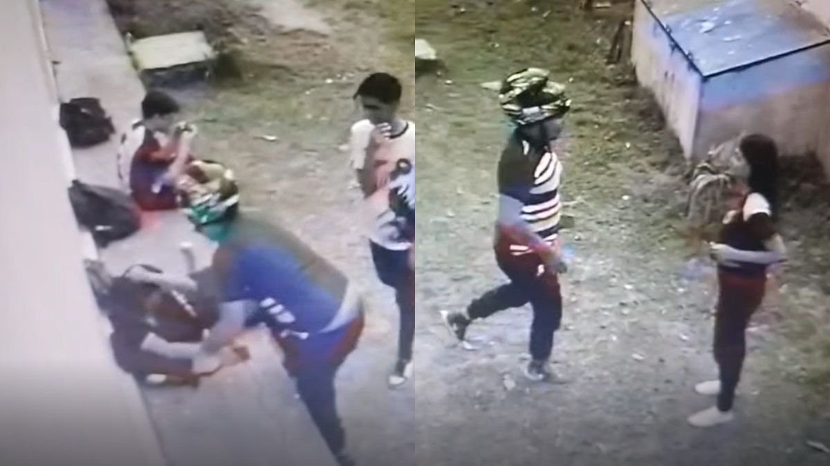 As imagens mostram quatro adolescentes reunidos em uma área externa, quando o suspeito, usando capacete, se aproxima rapidamente. Com uma das mãos na cintura, indicando estar armado, ele aborda os estudantes. Um dos jovens se recusa a entregar o aparelho celular e é agredido pelo assaltante, que logo recolhe outros dispositivos e foge.